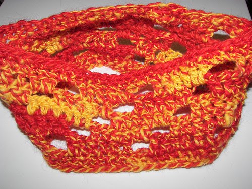 This is her project Gryffindor Diagon Cowl. She crochet this using her very own handspun!